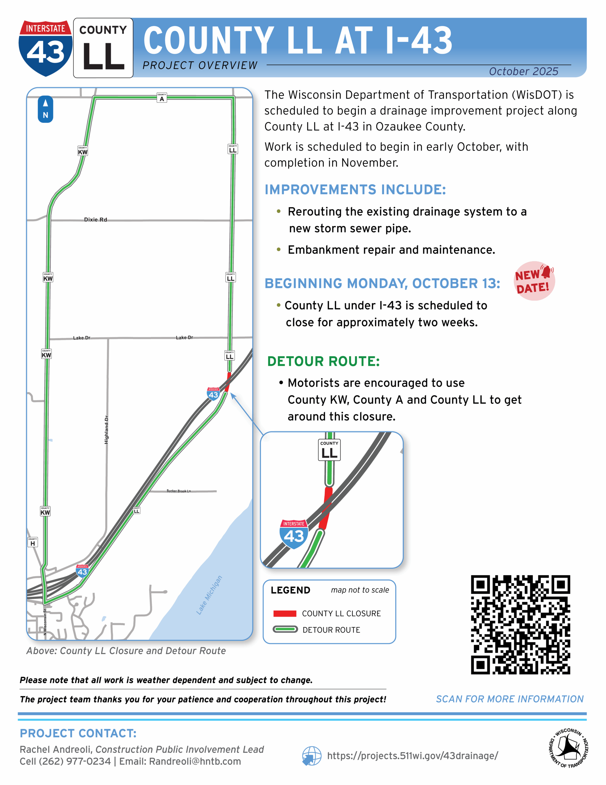 A full closure of County LL is anticipated during construction and a detour will be posted.