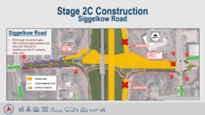 • Eastbound Siggelkow Road is open to through traffic. Westbound Siggelkow Road will remain closed to through traffic between Paulson Road/Triangle Street and Terminal Drive until approximately November 2025.